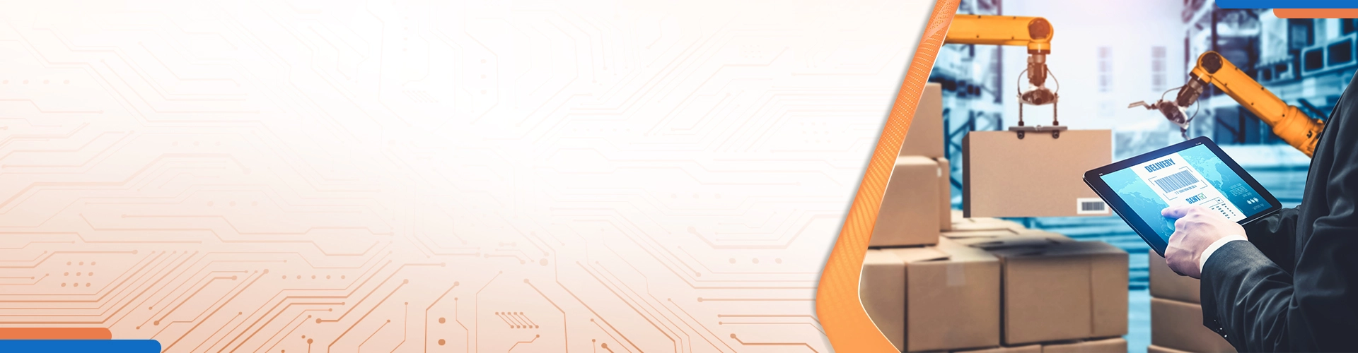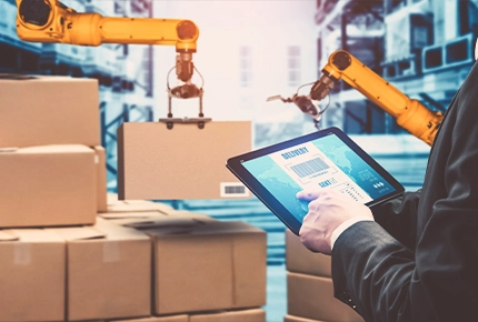 Person using tablet to manage warehouse automation and deliveries, representing iLogistech 3PL logistics software for efficient supply chain management.logistics software pattern banner