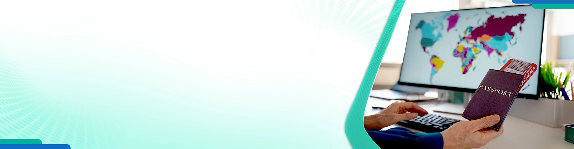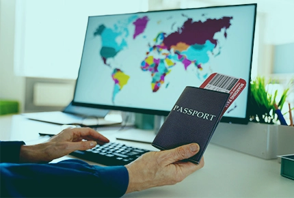 Person holding passport and ticket near computer showing world map, symbolizing how a visa management system simplifies complex processes and workflows.visa management software pattern banner